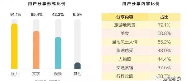 報(bào)告指出,分享已經(jīng)成為當(dāng)代旅行者的行為偏好。同程藝龍的調(diào)研數(shù)據(jù)顯示,60.8%的用戶(hù)在過(guò)去一年中有過(guò)旅游經(jīng)歷的分享行為,分享載體以圖片為主(91.1%),配合文字內(nèi)容。同時(shí),短視頻的分享熱度也不斷攀升,42.3%的用戶(hù)使用過(guò)這一分享載體;馬蜂窩旅游網(wǎng)的調(diào)研數(shù)據(jù)顯示,用戶(hù)分享的內(nèi)容以風(fēng)景和美食為主,當(dāng)?shù)仫L(fēng)土人情、旅行感受、人物照片分列三、四、五位。